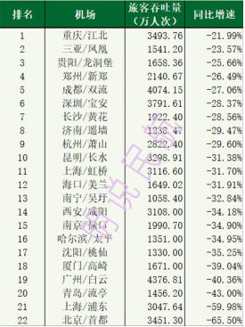 2020年中国大型机场表现(旅客量增速)排名,重庆机场抢眼
