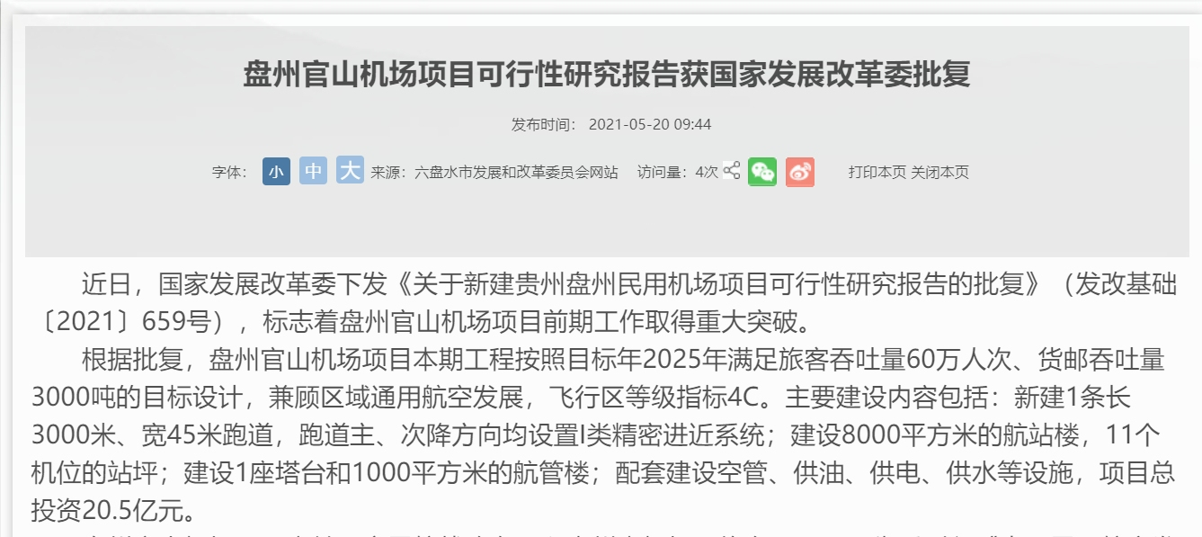 民航资源网2021年5月20日消息:据六盘水发改委消息,近日,国家发展改革委下发《关于新建贵州盘州民用机场项目可行性研究报告的批复》(发改基础〔2021〕659号),标志着盘州...