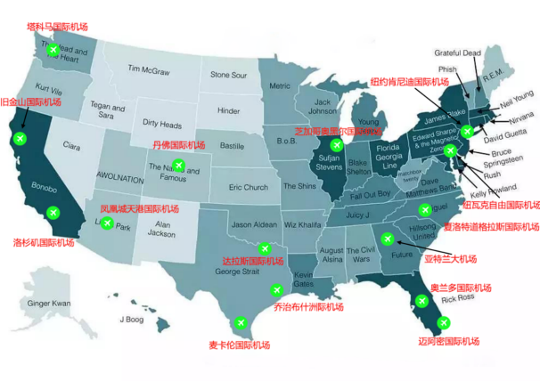 美國旅客吞吐量前15名機場分布圖