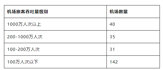 按照機場旅客吞吐量級別統計的各類別機場數量