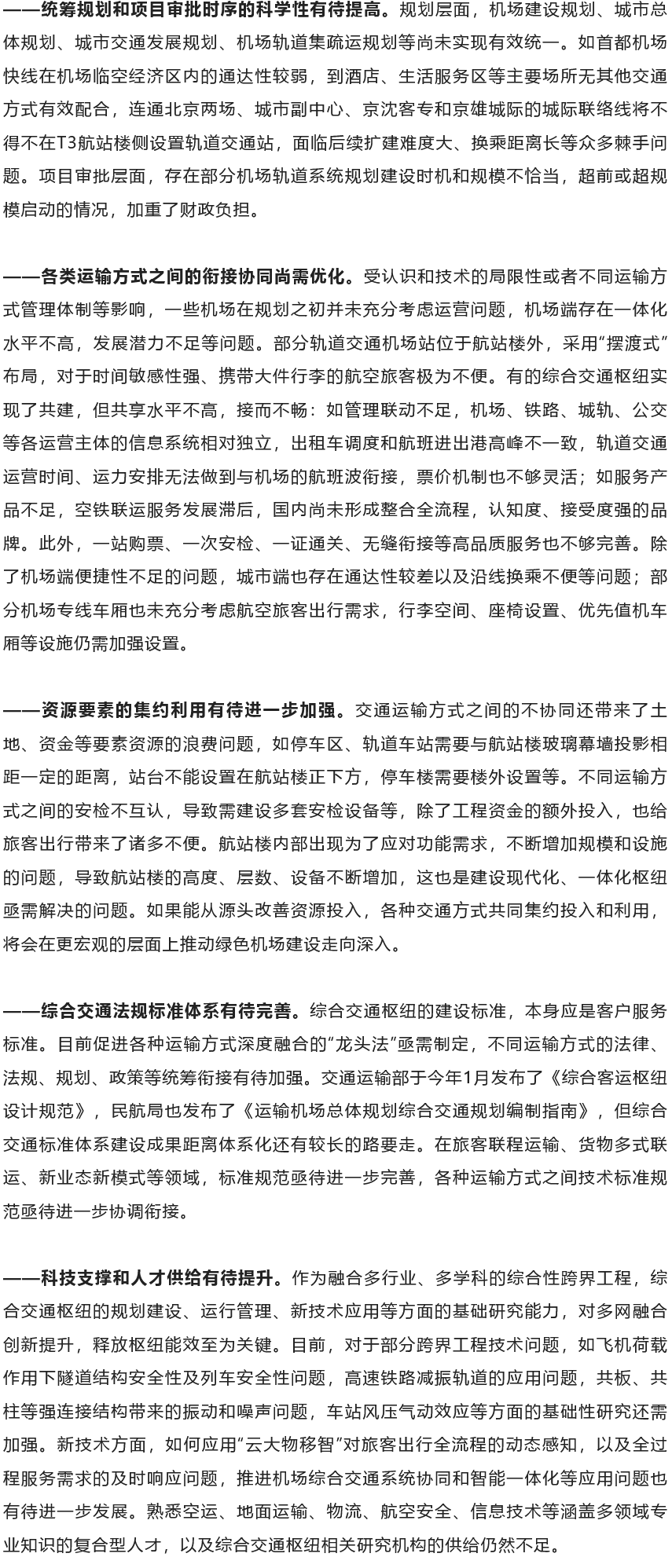 我國機場發展已經進入規劃建設高峰期、運行安全高壓期、轉型發展關鍵期和國際引領機遇期,“十四五”時期民航要新增運輸機場30個以上,旅客吞吐量前50名的機場超過40個要實施改擴建,全部是“多航站樓+多跑道”的大型綜合立體交通樞紐工程??紤]我國樞紐機場多為點對點客流,旅客中轉比例偏低,大量旅客的空陸側轉換將產生持續的高強度的地面交通壓力。軌道系統運量大、速度快、準點率高,且能提供安全、舒適、綠色的服務,可以支撐不同層次人群的出行需求,因此成為機場集疏運體系中的主導方式。軌道引入機場,也帶來了建設主體多、綜合集成度高、界面交叉復雜等挑戰。與此同時,我們在綜合交通樞紐的規劃設計、銜接布局、服務質量、經營管理、科技支撐等方面仍然面臨不少困難和問題。主要體現在五個方面: