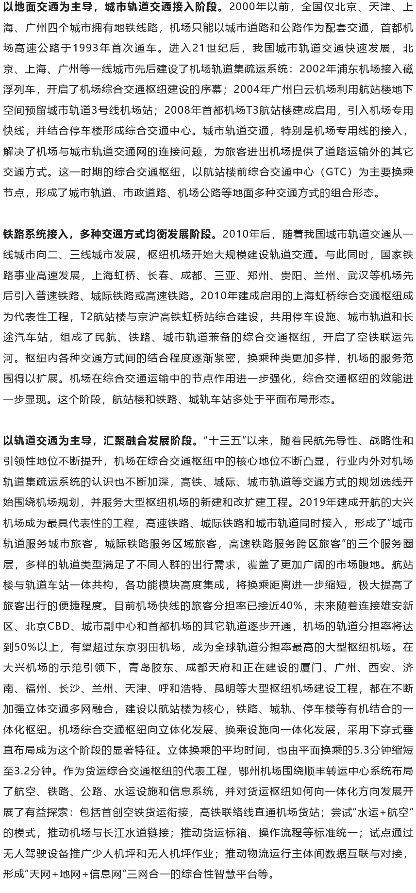 一直以來,民航以其高效便捷、機動靈活、國際性強等特點,受到廣大旅客歡迎,截至目前,全國頒證運輸機場數量達到254個,航空服務網絡已經覆蓋全國92%的地級行政單元、88%的人口、93%的經濟總量,民航旅客周轉量在綜合交通中的占比達到33.1%。在中國民航快速發展過程中,為方便旅客出行、暢通貨物運輸,民用機場逐步匯聚城市道路、高速公路、城市軌道、鐵路等多種交通方式,形成了44個以機場為核心的綜合交通樞紐,發展歷程大體可以分為三個階段: