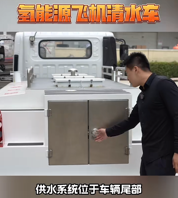 這是一款飛機清水車,專為飛機補充旅客在航班上所有的生活用水,它采用國內(nèi)首創(chuàng)氫燃料專屬底盤構架,只需要加氫5分鐘,即可行駛300公里以上,既便捷又環(huán)保。